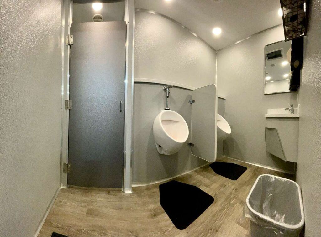 The eight-stall shower trailer can be configured for male/female use in a 4+4 or 2+6 floor plan, or as an eight-shower arrangement, depending on gender requirements. Each shower stall has a changing area, shower and private lock, hot and cold water, seating and space for toiletries, a dressing area, sinks, and power outlets.